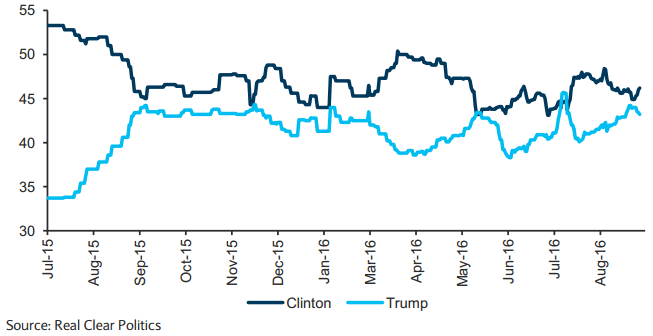 More important will be the first (out of three) US presidential debates on Monday. As the race between Hillary Clinton and Donald Trump has tightened and we approach November 8, we expect a tighter correlation between the financial asset prices and the subjective assessment of the outcome of the elections (Figure 2). The higher percentage of undecided voters (around 20%) compared to four years ago (12%) increases the relevance of the debates as they could shift the odds in either direction.