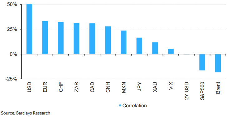 Although USDMXN tends to trade with an upside skew, in the past few days, the market has been clearly biased to the upside. Despite the undervaluation of MXN, the skew continues to widen (Figure 3). In addition, the “realized” skew has increased substantially, even adjusted by what is implied in the options market. In addition, market nervousness about the US presidential elections has increased USDMXN speculative activity, driving 3m risk reversals relative to some of its peers to levels not reached in the past ten years (Figure 4).