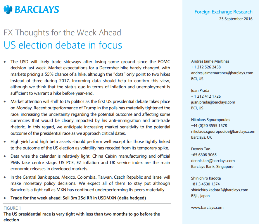 •  Market attention will shift to US politics as the first US presidential debate takes place on Monday. Recent outperformance of Trump in the polls has materially tightened the race, increasing the uncertainty regarding the potential outcome and affecting some currencies that would be clearly impacted by his anti-immigration and anti-trade rhetoric. In this regard, we anticipate increasing market sensitivity to the potential outcome of the presidential race as we approach critical dates.